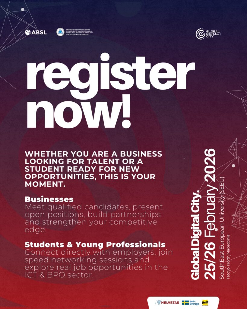 On 25 and 26 February 2026, at the premises of the South East European University in Tetovo, organized by ABSL, “Global Digital City 2026” will be held — a regional event focused on strengthening the competitiveness of the ICT and BPO sector through new talents, partnerships, and innovation.